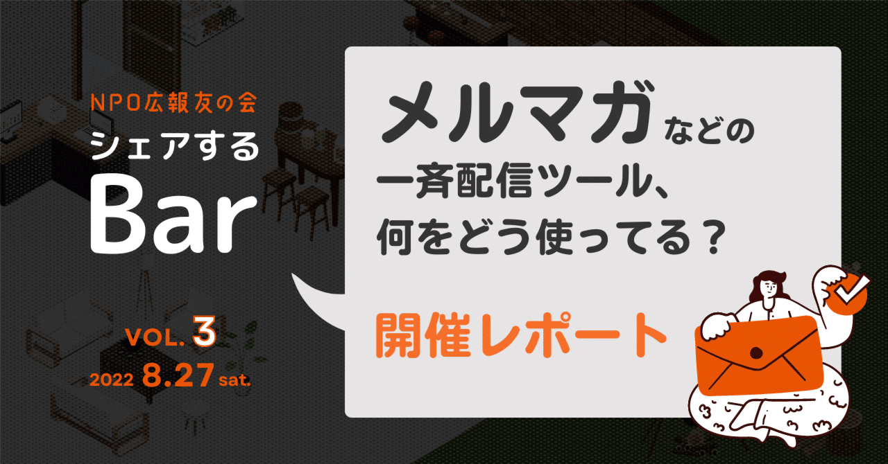 マキノが世話人を務めるNPO広報友の会主催のイベント「シェアするbar」、2022年8月27日のテーマは「メルマガなどの一斉配信ツール、何をどう使ってる?」でした。